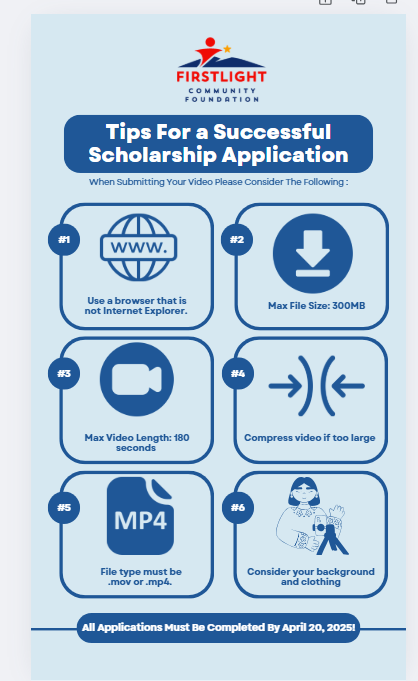 The FirstLight Community Foundation Scholarship supports graduating high school seniors in El Paso, Fort Bliss, and Dona Ana County, as well as dependents of FirstLight FCU employees. Recipients are selected based on extracurricular involvement, GPA, and a video submission. Personality and creativity are encouraged! Share what makes you, you! 🎬✨