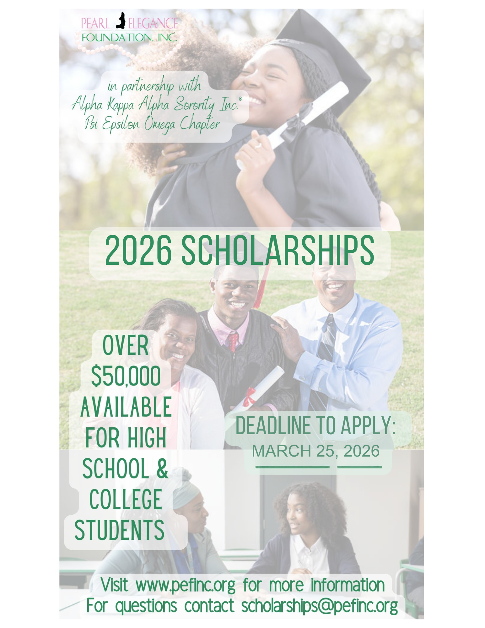 Immediate family (child, step-child, grandchild, sibling, step-sibling, niece and/or nephew) or members of Psi Epsilon Omega Chapter of Alpha Kappa Alpha Sorority, Inc.® are not eligible to apply.